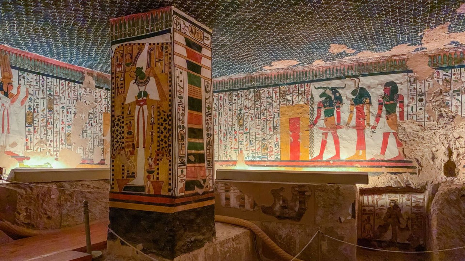 A narrativa visual nas paredes da tumba descreve a jornada da rainha em direção ao além-mundo. Vemos Nefertari jogando Senet (um antigo jogo de tabuleiro que simbolizava o destino), sendo guiada pela mão pela deusa Ísis e prestando homenagens a Osíris e outras divindades. Cada detalhe, desde os cílios da rainha até as penas das asas dos deuses, foi pintado com uma precisão que demonstra o auge da habilidade dos artistas de Deir el-Medina. O teto, pintado em um azul profundo salpicado de estrelas douradas, cria a ilusão de que a rainha repousa sob o próprio céu noturno.