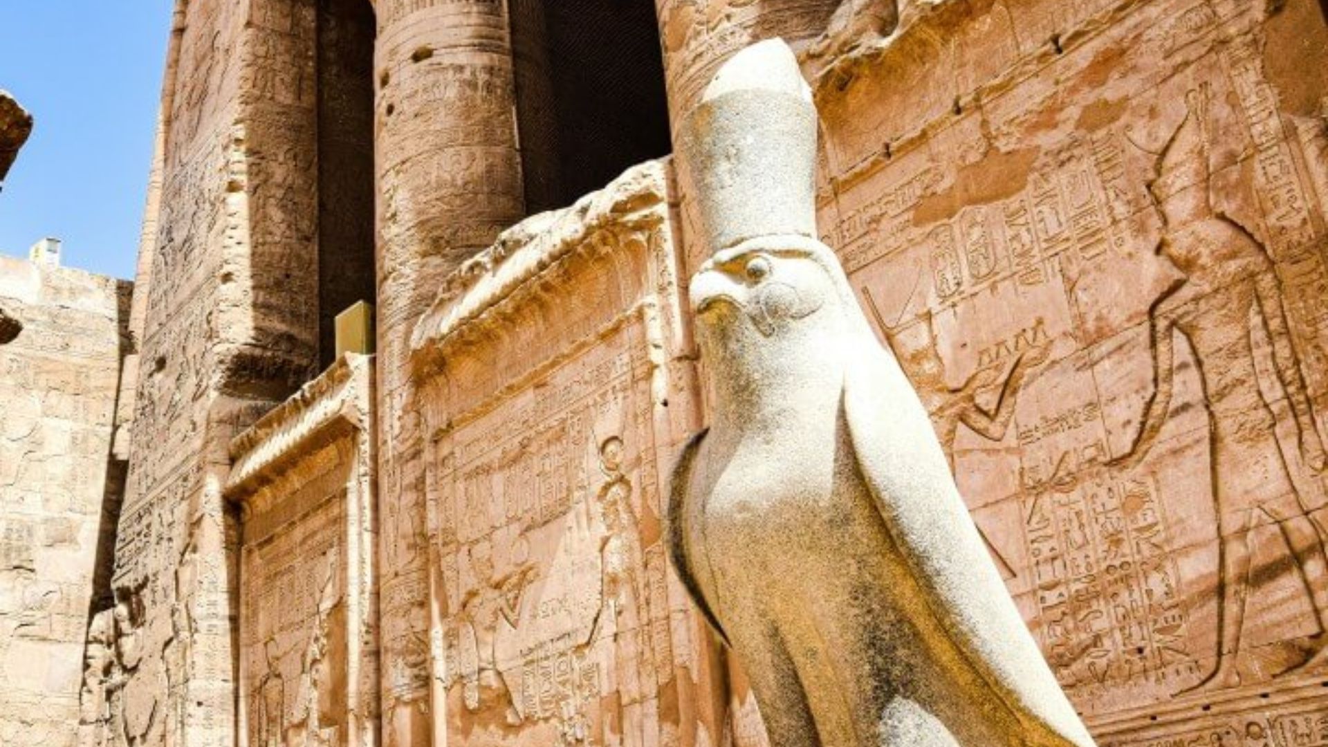 O grande destaque de Edfu é o seu portal de entrada, que possui 36 metros de altura e é decorado com relevos gigantescos do faraó derrotando seus inimigos diante de Hórus. Na entrada do pátio principal, duas estátuas colossais de Hórus em forma de falcão, esculpidas em granito preto, guardam a passagem. O olhar altivo e a coroa dupla (representando o Alto e o Baixo Egito) dessas estátuas tornaram-se símbolos icônicos da majestade egípcia.