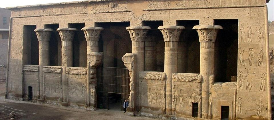 Do edifício original não resta hoje mais que o vestíbulo hipostilo edificado na época do imperador Cláudio e em perfeito estado de conservação, apesar de ter sido transformado em igreja durante a época copta e utilizado em tempos mais recentes como depósito para colheita de algodão.