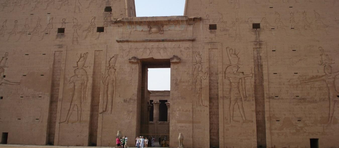 TEMPLO DE EDFU: o templo que fazia parte de uma área sagrada muito ampla, que se estende por baixo da povoação atual, talvez devido a particular conformação geográfica do lugar, tem um insólito posicionamento em direção ao sul e não segundo o eixo leste-oeste, como na maioria dos outros templos.