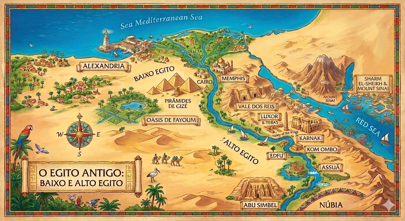 O norte do Egito é chamado de Baixo Egito, porque as terras estão numa altitude menor, e o Rio Nilo corre do Sul para o Norte, terminando no chamado Delta do Nilo.
