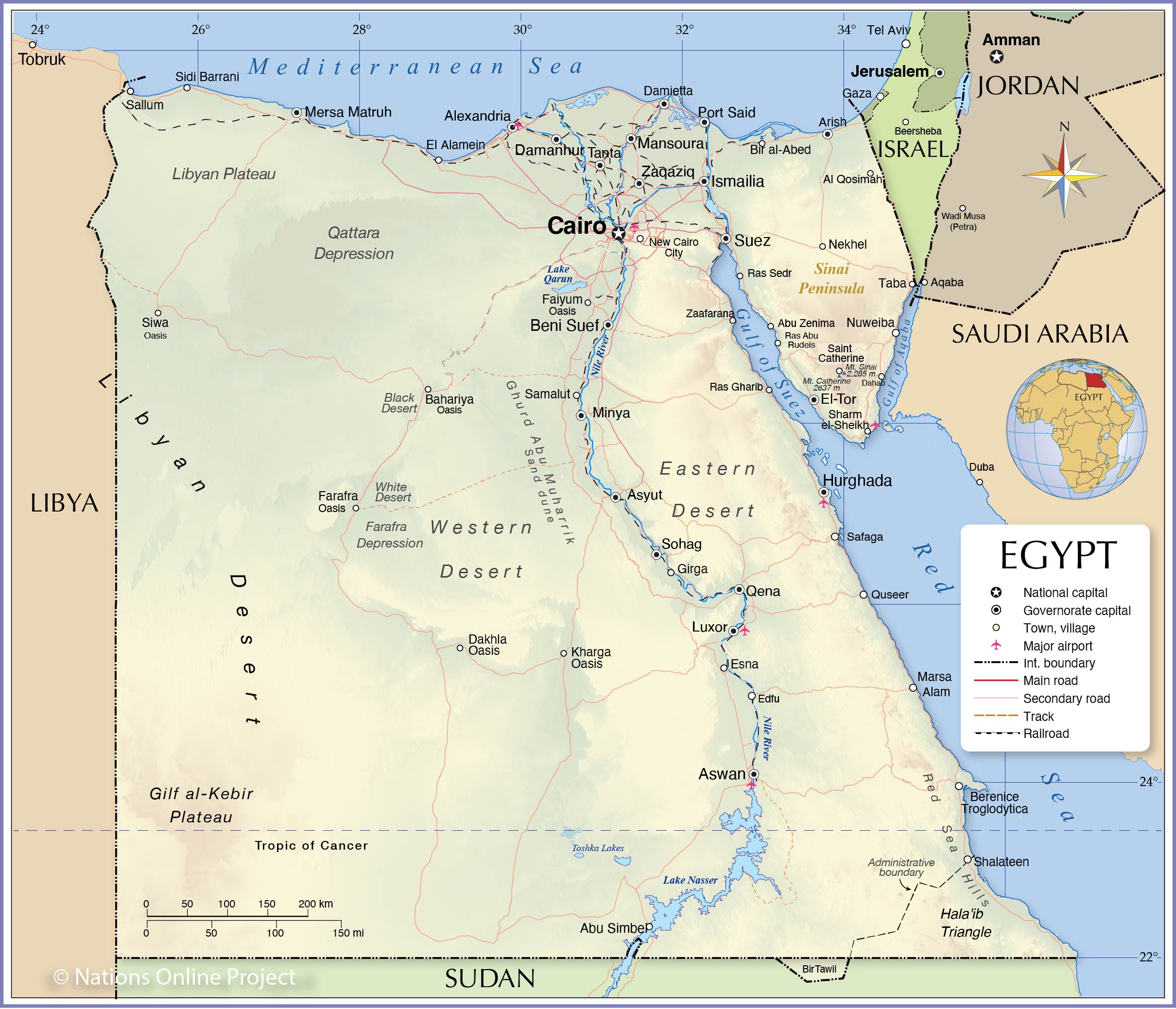 Localizado no norte da África e do Médio Oriente, é um país árabe com 1.001.450km², limitado a norte pelo mar Mediterrâneo, a Leste com a Faixa de Gaza, com Israel, com o Golfo de Aqaba (através do qual faz fronteira com a Jordânia e com a Arábia Saudita) e com o mar Vermelho, a sul com o Sudão e a oeste com a Líbia.